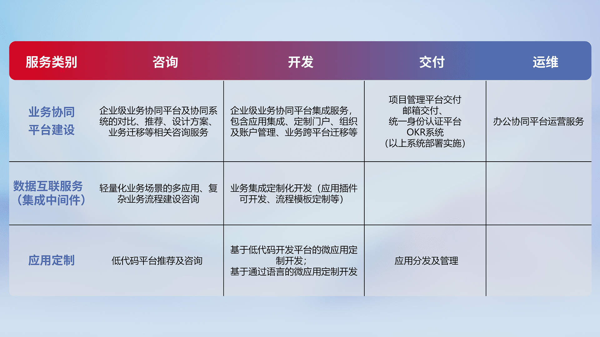 针对钉钉、、企微、、、IDaas等平台级产品提供产品的规划、、、方案、、、交付、、、定制化开发等服务,,实现如统一协同办公、、、智能客户服务、、混合会议管理、、、、智能数据查询、、等业务场景,,,实现数字化转型。。。
